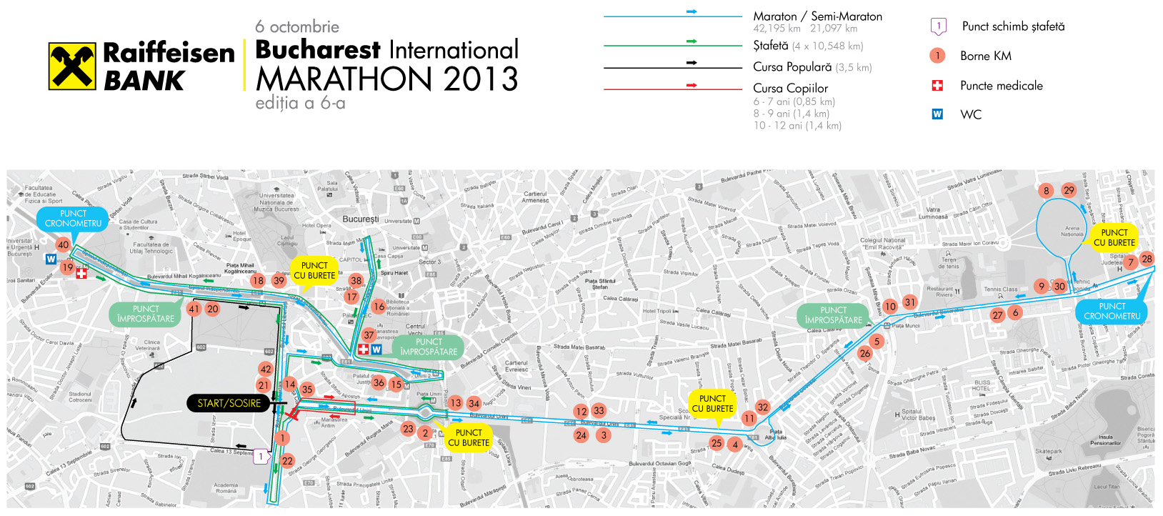 Pentru Cursele Maraton, Semi-maraton Volkswagen, Maraton Ștafetă Vodafone (42km, 21km și 4 x 10 km) : Piața Constituției; Bulevardul Libertății între Piața George Coșbuc și Splaiul Independenței; bd Unirii pe toată lungimea; bd Decebal pe toată lungimea; bd. Basarabia de la Piața Muncii (Hurmuzachi) pâna la intersecția cu bd. Chișinău; zona Național Arena; bd Națiunile Unite; strada Halelor; Splaiul Independenței pe ambele maluri ale Damboviței între Pod Eroilor/ Știrbei Vodă și Piața Unirii; Calea Victoriei între intersecția cu Splaiul Independenței și cea cu Ion Câmpineanu.