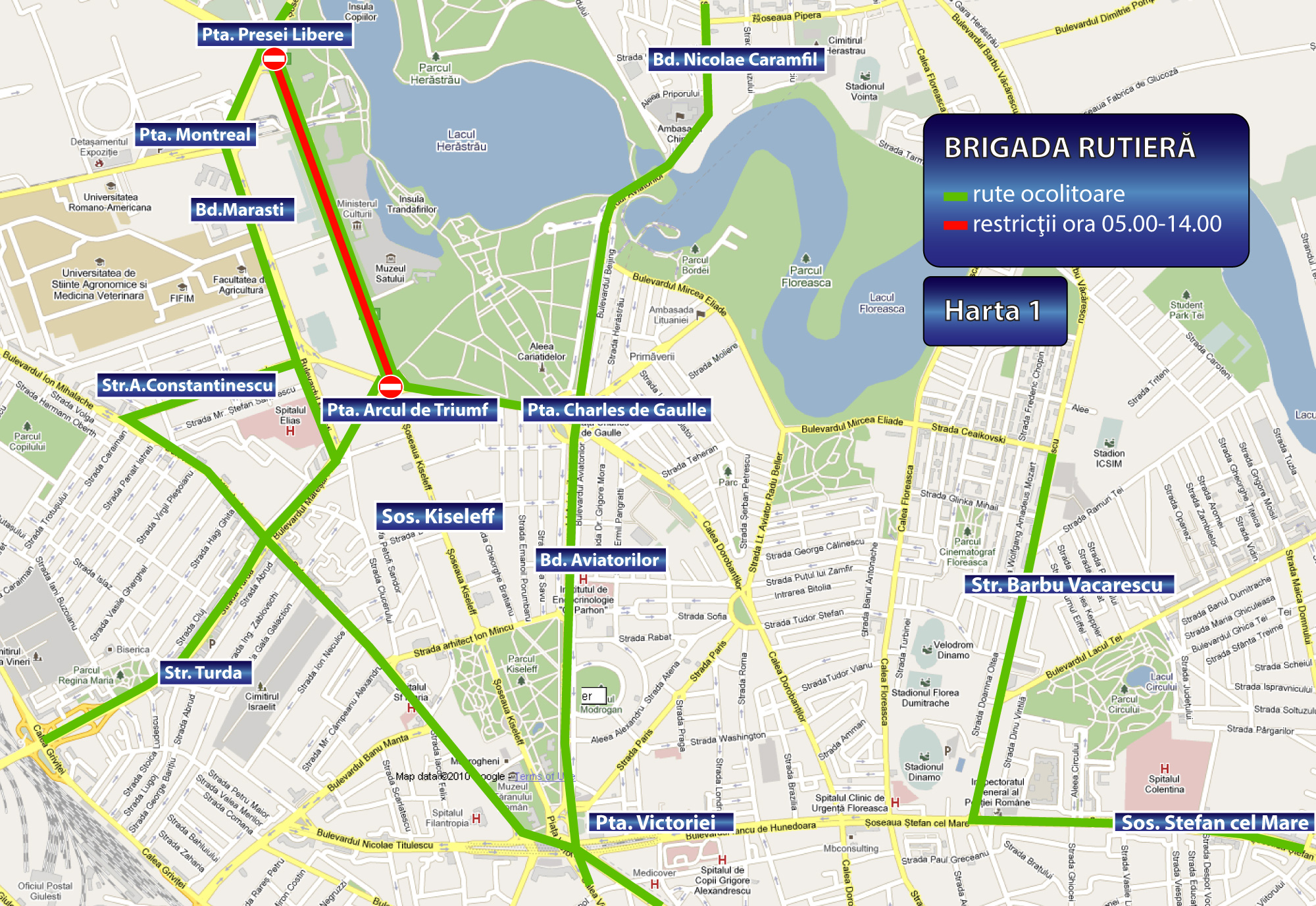 între orele 09:00 – 14:00, va fi închisă total circulaţia pe şos. Kiseleff între Piaţa Presei Libere şi Piaţa Victoriei, precum şi a străzilor adiacente, pe bd. Al. Constantinescu, între bd. Mărăşti şi Arcul de Triumf, bd Mareşal Averescu între bd. Mărăşti şi Arcul de Triumf, bd Constantin Prezan între Piaţa Arcul de Triumf şi Piaţa Charles de Gaulle şi restricţionarea temporară pe str. Ion Mincu între bd. Aviatorilor şi bd. Ion Mihalache.
