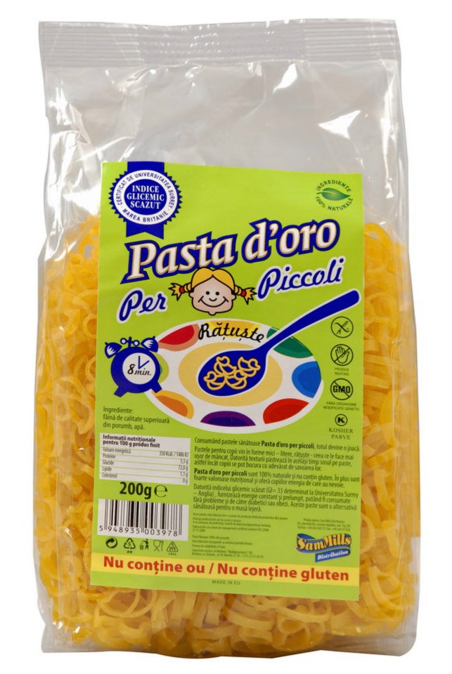 Disponibile in doua sortimente, Ratuste si Alfabet, pastele Pasta D’Oro per Piccoli sunt un segment special de paste fainoase dedicate copiilor. Cu acest sortiment venim in intampinarea nevoii parintilor de a asigura o alimentatie cat mai sanatoasa si echilibrata copiilor lor.