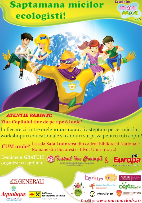 “Saptamana micilor ecologisti” este un eveniment GRATUIT, organizat de Mac-Mac Kids.ro cu sprijinul Teatrului Ion Creanga si sustinut de Europa FM.