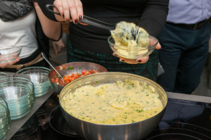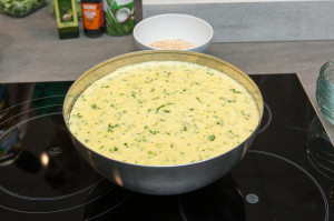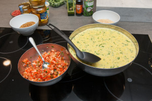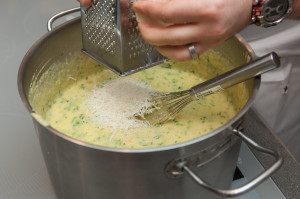 Mod de prepapare: Puneti la fiert apa impreuna cu sarea, piperul, laptele si untul. Cand fierbe, se pune malaiul si se fierbe aproximativ 20 de minute. Cand este gata se introduc verdeturile tocate marunt si branzeturile rase. La servire se pot adauga diferite toping-uri obtinute din legume proaspete. De exemplu rosii tocate marunt amestecate cu busuioc.