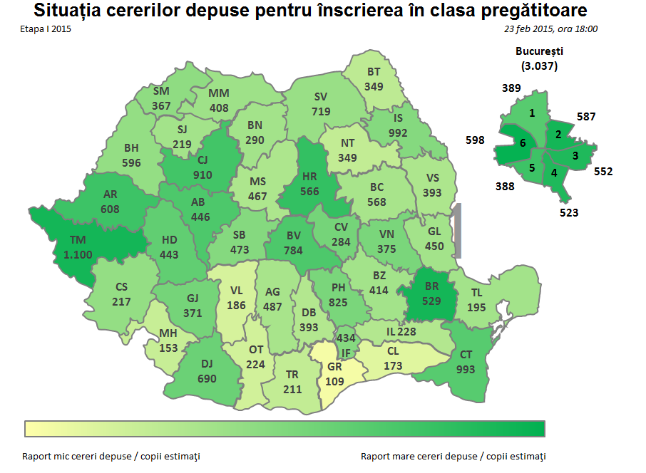 Potrivit datelor înregistrate în sistem, în prima zi de înscriere, luni, 23 februarie, până la ora 18:00, au fost completate la nivel naţional 22.025 de cereri. Dintre acestea, 18.932 de cereri vizează copiii cu vârsta de 6 ani, împliniţi înainte de data de 1 septembrie 2015, iar 3.093 de cereri, copiii cu vârsta de 6 ani (împliniţi începând cu data de 1 septembrie 2015).