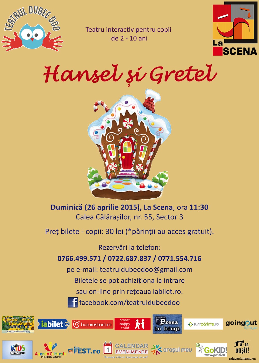 Duminică, 26 aprilie 2015, de la ora 11.30, La Scena (Calea Călărașilor, nr. 55, sector 3, București) actorii Teatrului Dubee Doo vor susține reprezentația piesei de teatru pentru copii “Hänsel și Gretel”, adaptare după povestea cu același titlu scrisă de Frații Grimm.