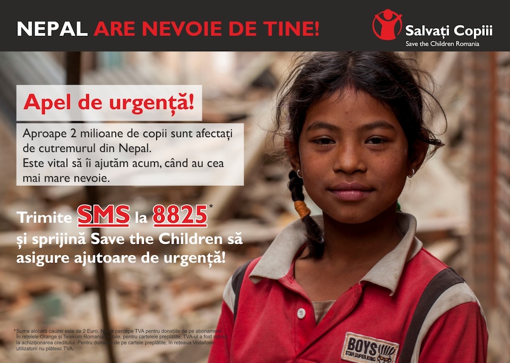 “Lansăm şi noi, Salvaţi Copiii România, un apel de urgenţă pentru a-i ajuta pe cei vulnerabili din Nepal, care au nevoie de noi. Puteţi să donaţi 2 euro la SMS 8825 şi veţi contribui la distribuirea ajutoarelor vitale. Suntem în legătură strânsă cu colegii noştri de la Save the Children Nepal, iar fondurile strânse vor ajunge la ei în cel mai scurt timp”, a declarat Gabriela Alexandrescu, Preşedinte Executiv Salvaţi Copiii.
