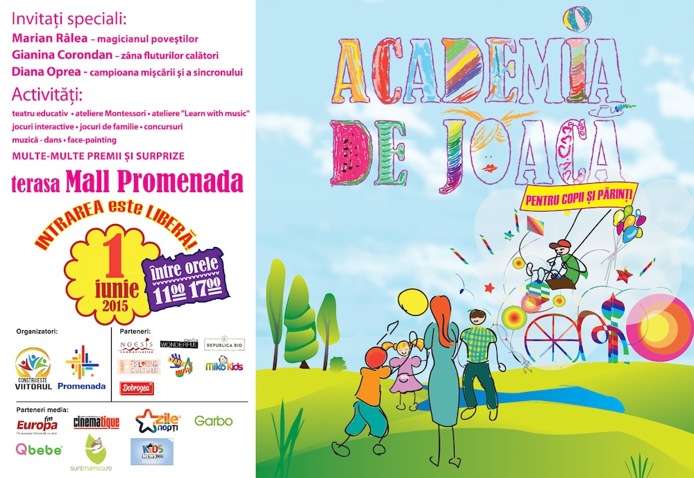 Asociaţia Nonguvernamentală „Construieşte Viitorul” şi Mall Promenada îşi deschid inima şi terasa pentru a reda o astfel de zi, luni, 1 iunie, începând cu ora 11:00. Academia de Joacă, cel mai așteptat eveniment dedicat interacţiunii copil-părinte, va avea loc în decorul relaxant al terasei Mall-ului Promenada, din Calea Floreasca 246B.
