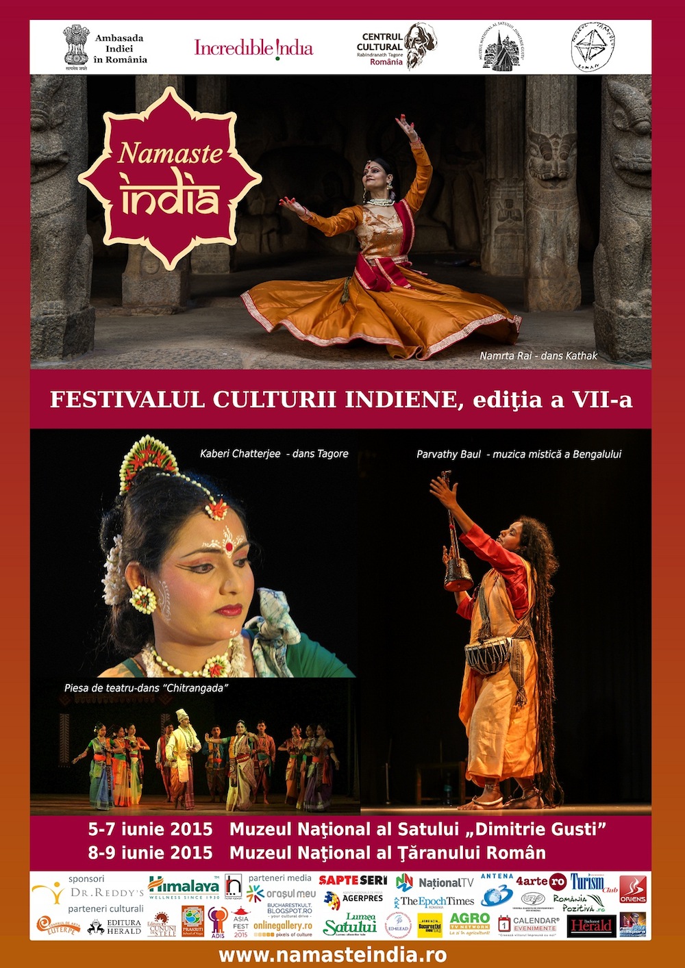 Sub înaltul patronaj al Ambasadei Indiei în România, Centrul Cultural „Rabindranath Tagore”, în parteneriat cu Muzeul Naţional al Satului „Dimitrie Gusti”, Muzeul Național al Țăranului Român și India Tourism Office Frankfurt, vă invită la cea de-a VII-a ediţie a festivalului culturii indiene „Namaste India”, care va avea loc în perioada 5-9 iunie 2015, la Bucureşti.