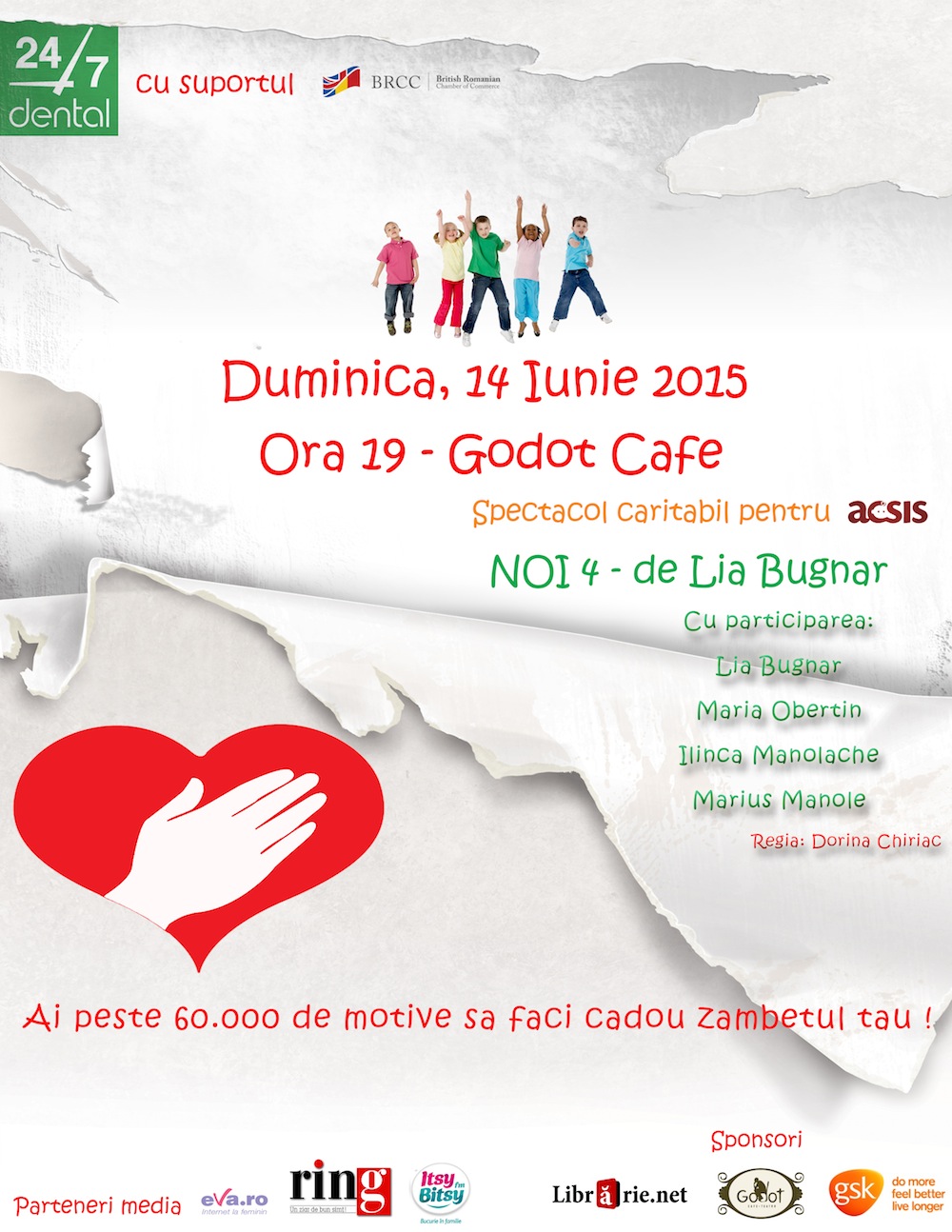 Asociația pentru o Comunitate Solidară și Intervenție Socială (ACSIS), împreună cu 24/7 Dental și Camera de Comerț Britanică Română, te invită să participi duminică, 14 iunie 2015, ora 19.00, la Godot Cafe, la o piesă de teatru: NOI 4. Evenimentul este caritabil și are ca obiectiv strângerea de fonduri necesare prevenirii abandonului copiilor români.