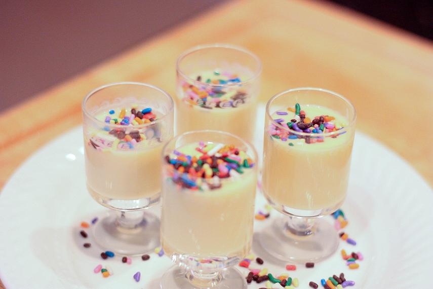 Tocati biscuitii prin tocator (chopper) pana obtineti o faina. Fierbeti apa in care s-a topit zaharul, 5 minute, pana se obtine un sirop cu care se opareste faina de biscuiti. Adaugati fructele curatate de coaja si maruntite cu ajutorul chopperului sau tocatorului. Amestecati bine si bateti compozitia pana obtineti o spuma. Lasati 10 minute la frigider inainte de a fi servita. Puneti in pahare si ornati cu bombonele colorate.