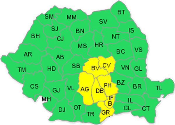 Avertizarea emisă de ANM a intrat in vigoare vineri la ora 08:30 şi este valabilă până la ora 16:00, interval în care va ploua în cea mai mare parte a Munteniei, sud-estul Transilvaniei, precum şi în zona montană aferentă. Zonele vizate de Codul Galben sunt Bucureşti şi judeţele Ilfov, Giurgiu, Argeş, Dâmboviţa, Braşov, Covasna şi Prahova.