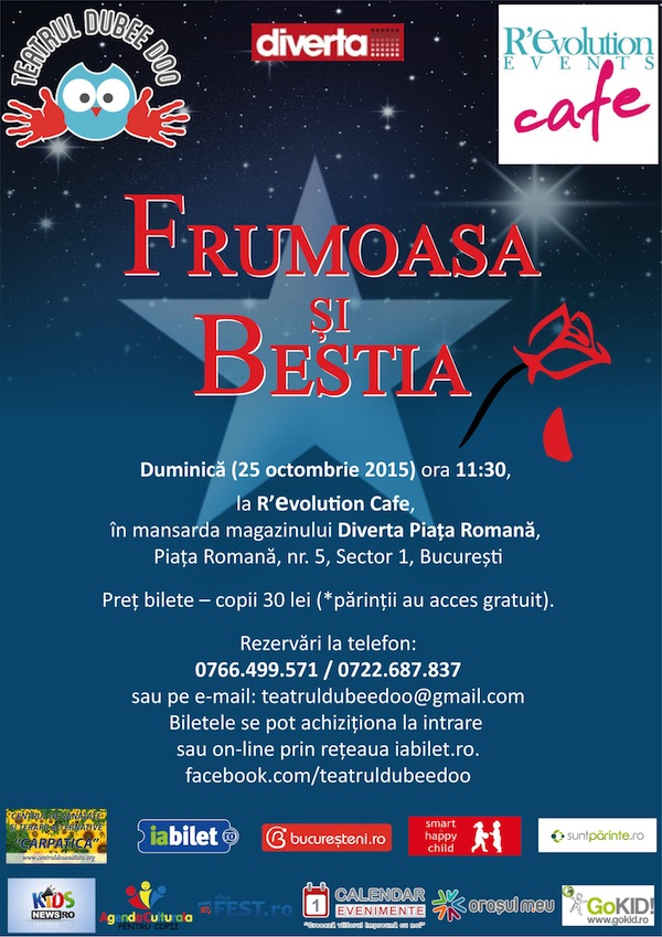 FB_25_10_2015Duminică, 25 octombrie 2015, de la ora 11.30, la R’evolution Cafe, în mansarda magazinului Diverta Piața Romană (Piața Romană, nr. 5, sector 1), actorii Teatrului Dubee Doo vor susține reprezentația piesei de teatru interactiv pentru copii “Frumoasa şi Bestia”, adaptare după povestea cu același titlu scrisă de Charles Perrault.