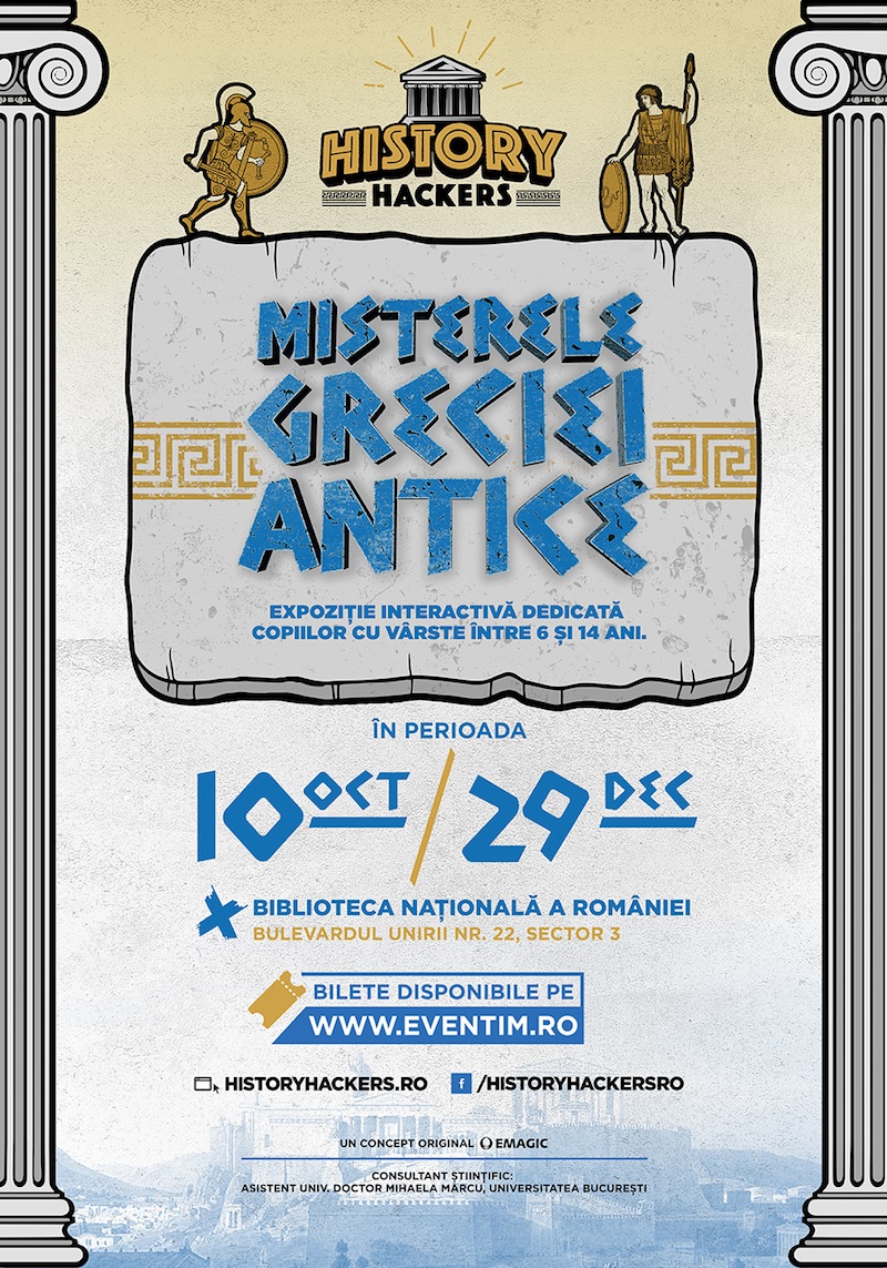 Dupa succesul primei expozitii intitulate “Secretele Egiptului Antic”, care a fost vizitata de zeci de mii de copii din Bucuresti si din tara, fiind organizata succesiv in Cluj-Napoca, Iasi, Timisoara, proiectul History Hackers revine cu o noua editie. Este randul Greciei Antice sa fie explorata intr-un decor spectaculos ce le va permite celor mici sa descopere intr-o maniera ludica, dar educativa, o parte din specificul acestei perioade. “Misterele Greciei Antice” continua astfel periplul cronologic prin istoria civilizatiilor antice, marcand o alta perioada importanta a existentei omenirii. Expozitia va include prezentari si explicatii ale momentelor, personajelor si obiceiurilor esentiale ale epocii, imbinand faptele istorice redate pe intelesul copiilor, cu elemente de butaforie, dar si ateliere interactive cu scop educational: de la butaforii reprezentand Calul Troian, Acropolele, Labirintul Minoic, cariatide, atlanti sau teatre grecesti, pana la ateliere de scriere sau experimente stiintifice, toate vor incerca sa explice istoria pe intelesul copiilor.