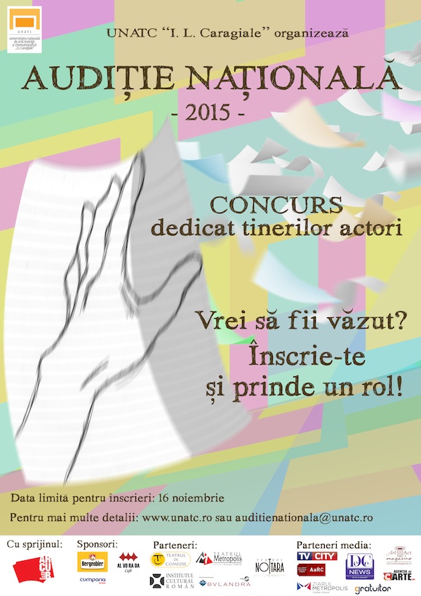 UNATC „I.L.Caragiale“ anunță deschiderea înscrierilor pentru cea de-a III-a ediție a Audiției Naționale – festival dedicat tinerilor actori și studenților din ultimul an de studiu, specializarea Arta Actorului, de la toate universtățile din țară, de stat și private. Desfășurat sub formă de competiție, festivalul este o ocazie importantă de afirmare la început de carieră artistică în teatru și film, de cunoaștere a colegilor de generație și de explorare a unor metode și tehnici de lucru pe care tinerii au șansa să le împărtășească.