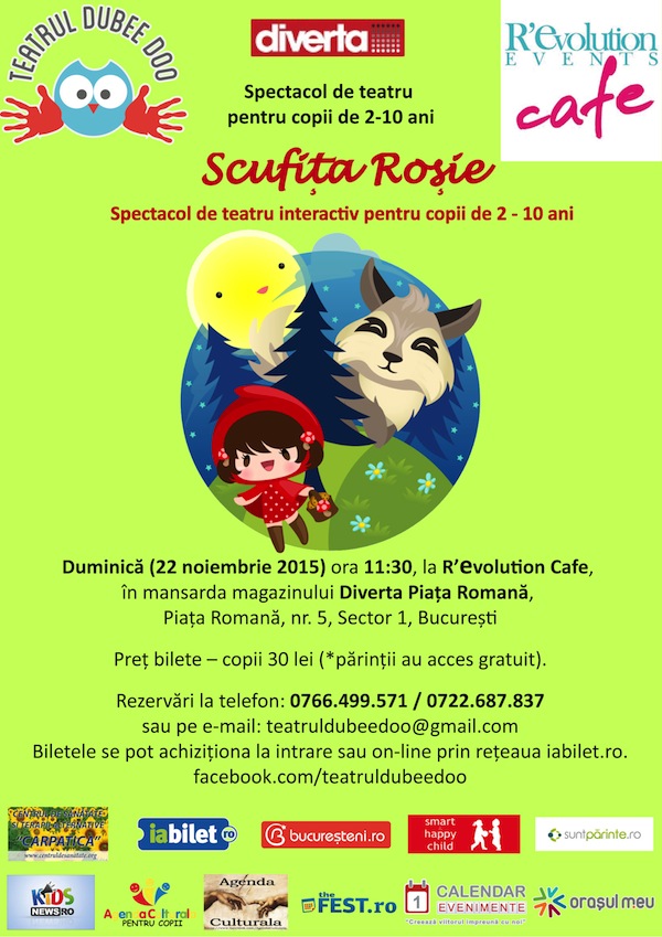 Duminică, 22 noiembrie 2015, de la ora 11.30, la R’evolution Cafe ( la Diverta – Piața Romană, nr. 5, sector 1, București) actorii Teatrului Dubee Doo vor susține reprezentația piesei de teatru interactiv pentru copii “Scufița Roșie”, adaptare după povestea cu același titlu scrisă de Fraţii Grimm.