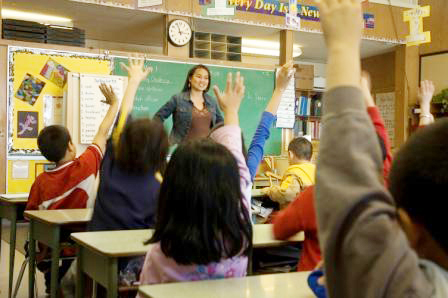 AcasăScoala gimnaziala are prea putine optionale si ore de sport si prea multe materii obligatoriiElementary classroom setting. Focus on teacher and chalkboard.