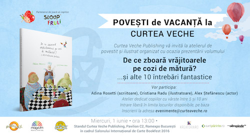 13.00-14.00 – Calatorie in lumea intrebarilor fantastice: „De ce zboara vrajitoarele pe cozi de matura?” de Adina Rosetti cu ilustratii de Cristiana Radu.