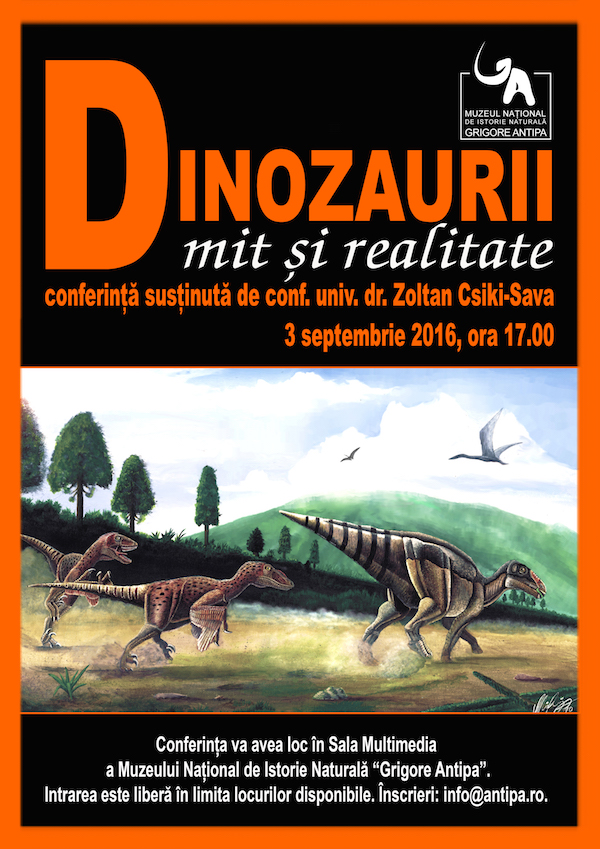 Dinozaurii intre mit si realitateMuzeul Național de Istorie Naturală „Grigore Antipa” are plăcerea să vă invite la conferința „Dinozaurii între mit și realitate”, susținută de către Conf. Univ. Dr. Zoltan Csiki-Sava, din cadrul Facultății de Geologie și Geofizică, Universitatea din București. Evenimentul va avea loc sâmbătă, 3 septembrie  începând cu ora 17:00, în Sala Multimedia a Muzeului.