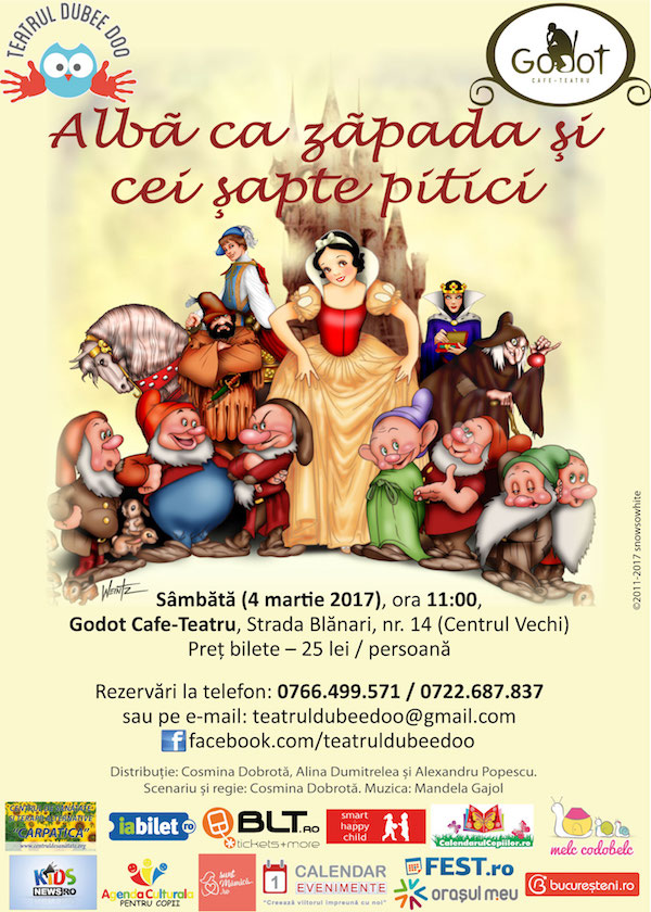 Sâmbătă, 4 martie 2017, de la ora 11.00, la Godot Cafe-Teatru, str. Blănari, nr. 14 (Centrul vechi), actorii Teatrului Dubee Doo vă invită la spectacolul de teatru pentru copii “Albă ca Zăpada și cei șapte pitici”, adaptare după povestea cu același titlu scrisă de Fraţii Grimm.