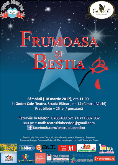 Sâmbătă, 18 martie 2017, de la ora 11.00, la Godot Cafe-Teatru, str. Blănari, nr. 14 (Centrul vechi) actorii Teatrului Dubee Doo vor susține reprezentația piesei de teatru interactiv pentru copii “Frumoasa şi Bestia”, adaptare după povestea cu același titlu scrisă de Charles Perrault.