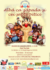 Sâmbătă, 11 noiembrie 2017, de la ora 11.00, la Club The HUB, Str. Bărăției, nr. 31 (lângă Magazinul Cocor), actorii Teatrului Dubee Doo vă invită la spectacolul de teatru pentru copii “Albă ca Zăpada și cei șapte pitici”, adaptare după povestea cu același titlu scrisă de Fraţii Grimm.