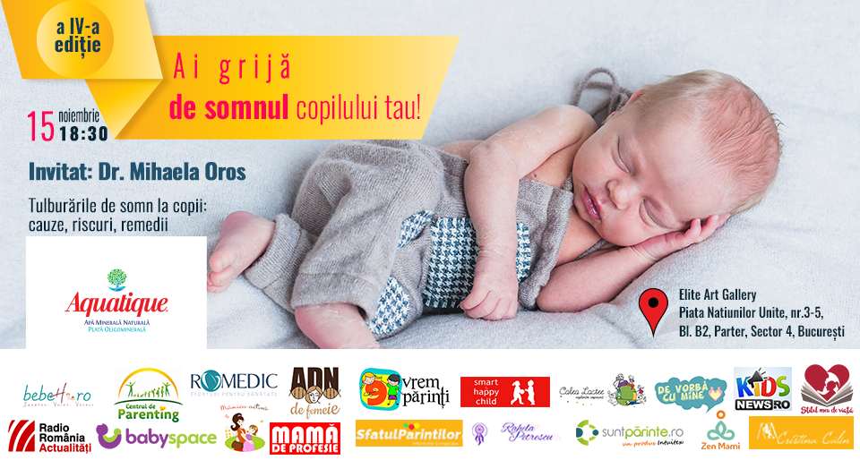 Pentru mai multe explicatii privind tulburările de somn la copii, vă invităm joi, 15 noiembrie, ora 18:30 la „Ai grijă de somnul copilului tău!- a IV a ediție”, susținut d-na Doctor Mihaela Oros – doctor în științe medicale, medic primar pediatru și specialist pneumolog, cu supraspecializare în somnologia pediatrică.