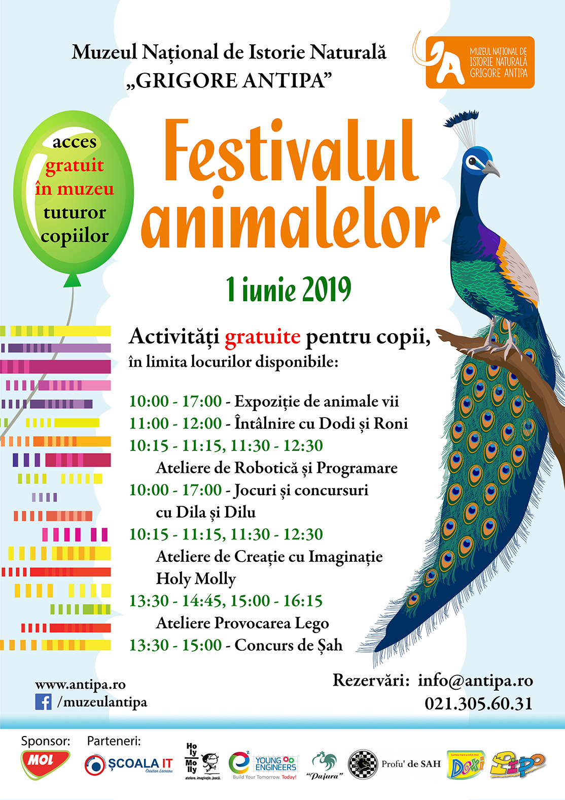 Cu ocazia Zilei Internaționale a Copilului, Muzeul Național de Istorie Naturală „Grigore Antipa” a pregătit o serie de activități distractive, conferințe, ateliere de creație cu imaginație și laboratoare de știință, precum și o expoziție cu animale vii, adusă la muzeu de Asociația „Pajura”. Cei mici vor putea admira cele mai spectaculoase rase de păsări şi exemplare de găini de rasă, porumbei aparţinând diferitelor rase şi varietăţi coloristice, fazani, papagali şi iepuri din cele mai frumoase rase europene, care vor popula curtea muzeului pentru două zile (1 și 2 iunie 2019). Dolofani sau subțirei, blănoși sau plini de pene, prietenii noștri necuvântători vă așteaptă să îi admirați în căsuțele lor! Pe lângă Festivalul Animalelor, cei mici vor avea prilejul să participe la nenumarate ateliere desfășurate atât în aer liber cât și în sălile atelier ale muzeului, precum și la o ediție specială a întâlnirii cu temerarii exploratori Dodi și Roni. De la distracția în aer liber nu vor lipsi nici carismaticii actori Tony Dumitrescu (Dilu) și Brîndușa Ionascu (Dila), care vor însufleți petrecerea prin jocuri, concursuri și multe alte plăcute surprize!