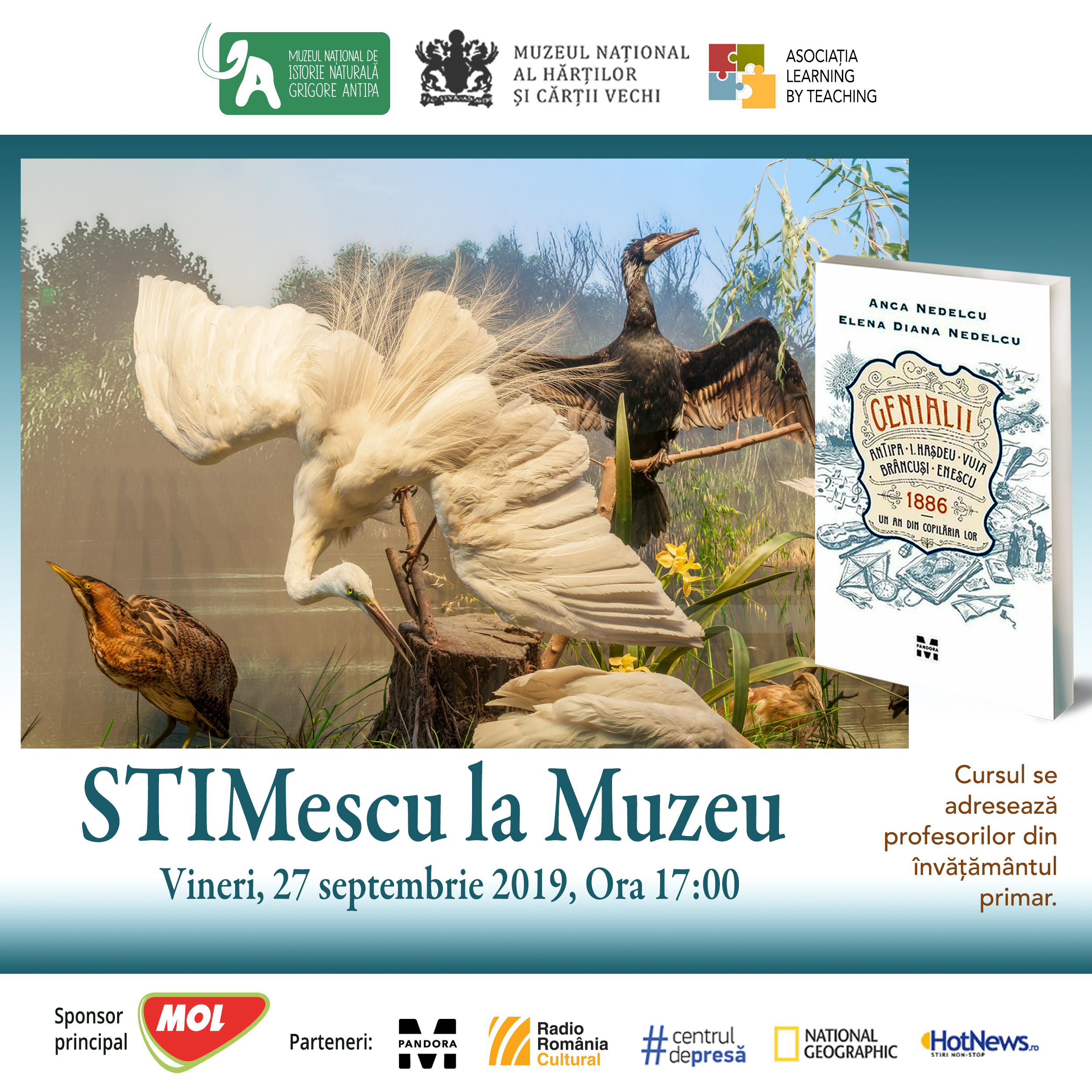 Pe 27 septembrie 2019, cu ocazia Nopții Cercetătorilor, îi invităm pe profesorii din învățământul primar să participe la proiectul STIMescu la Muzeu, care va avea loc anul acesta și la Muzeul Antipa. Cursul interactiv va începe la ora 17:00 în Sala Multimedia și va avea ca punct de plecare cartea „Genialii. Antipa, I. Hașdeu, Vuia, Brâncuși, Enescu. 1886 – Un an din copilăria lor”, scrisă de Anca Nedelcu și Elena Diana Nedelcu și apărută la editura Pandora M.