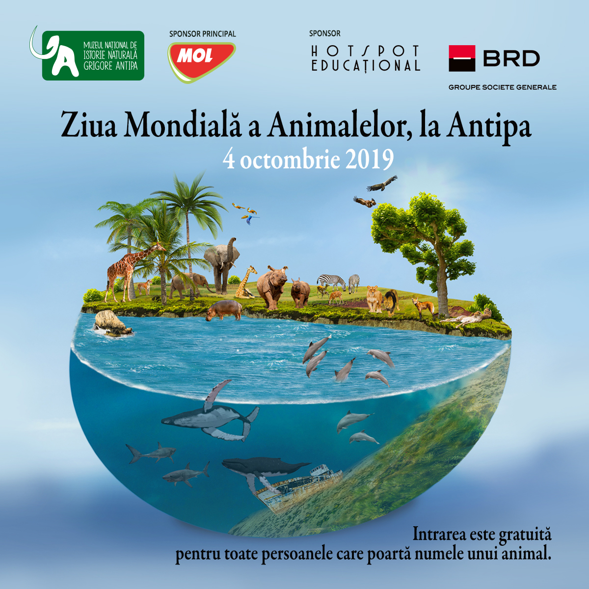 Vineri, 4 octombrie 2019, începând cu ora 10:00, Muzeul Național de Istorie Naturală „Grigore Antipa”, va asteapta sa sarbatoriti împreună Ziua Mondială a Animalelor! Cu acest prilej, toți vizitatorii care poartă numele unei vietăți din lumea necuvântătoarelor au acces gratuit în expoziția permanentă!