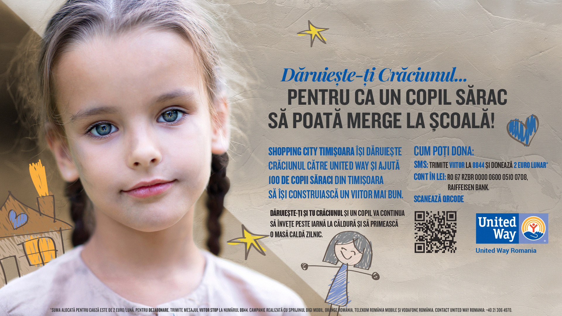 Magia Sărbătorilor va fi simțită anul acesta și de copiii mai puțin norocoși, întrucât Shopping City Timișoara își dăruiește Crăciunul pentru ca 100 de micuți din Timișoara susținuți de Fundația United Way să poată merge la școală.