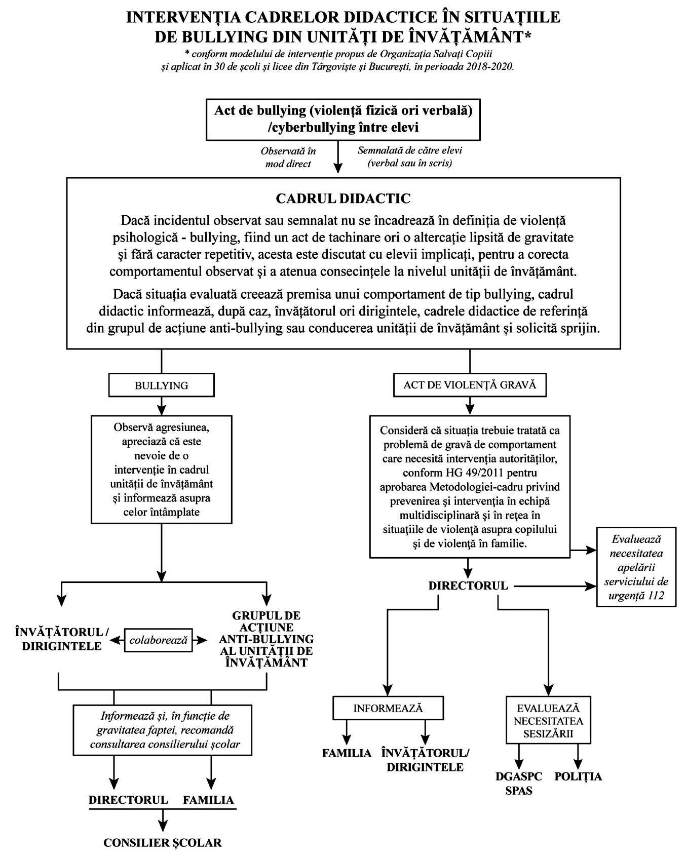 Astfel, pentru reducerea ratei de prevenire a violenței psihologice-bullying, în fiecare unitate de învățământ va fi înființat un grup de acțiune anti-bullying din care vor face parte maximum 10 membri. Între aceștia se vor regăsi directorul unității de învățământ, profesorul consilier școlar, trei cadre didactice formate în problematica violenței, inclusiv a violenței psihologice-bullying, doi sau mai mulți reprezentanți ai elevilor, un reprezentant al părinților, reprezentanți ai autorității locale. Rolul acestui grup este prevenirea, identificarea și soluționarea faptelor de bullying comise între elevi, prin acțiuni fizice, verbale, relaționale și/sau cibernetice.
