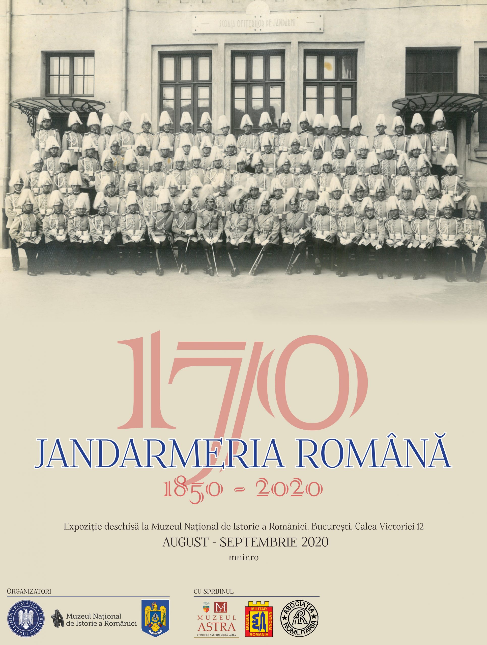 Muzeul Național de Istorie a României (MNIR), în colaborare cu Inspectoratul General al Jandarmeriei Române, Muzeul Jandarmeriei Române, Complexul Național Muzeal ASTRA, Muzeul Militar Național Regele Ferdinand I și Asociația RoMilitaria, anunță deschiderea expoziției „Jandarmeria Română 1850 – 2020”. Aceasta va putea fi vizitată începând de miercuri, 29 iulie 2020, ora 10:00.