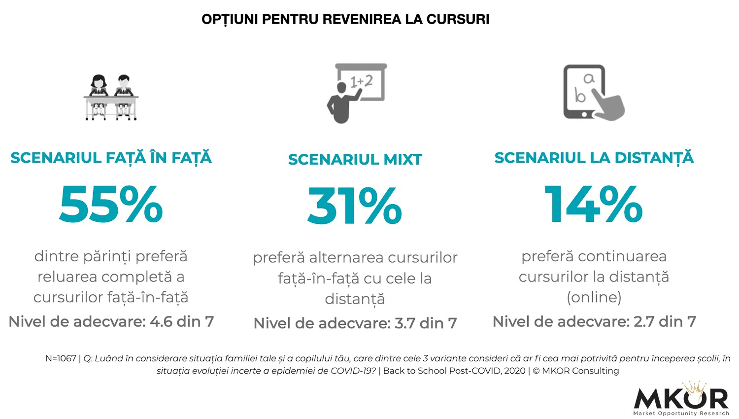 Pentru revenirea la cursuri în această toamnă, majoritatea părinților români preferă scenariul cursurilor față în față, pe care îl consideră cel mai potrivit. Mai exact, 55% dintre părinții care au răspuns studiului preferă revenirea fizică a elevilor în clase din 14 septembrie. Cursurile față în față sunt preferate, mai ales, în cazul preșcolarilor și elevilor de liceu.