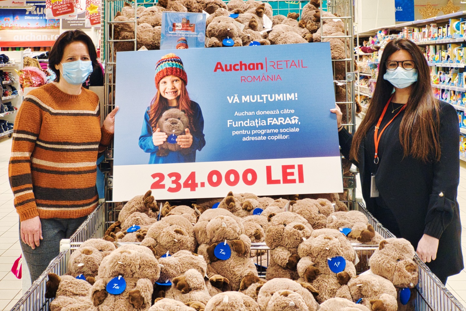 Peste 230.000 de lei au fost donați de Auchan Retail România pentru programul Fundației FARA – Combaterea Sărăciei prin Educație. Scopul acestui program este de a oferi suport educațional, familial și social copiilor proveniți din medii vulnerabile și familiilor acestora. Suma a fost strânsă în cadrul unei campanii derulate în hipermarketurile Auchan în perioada 30 septembrie – 31 decembrie 2020, prin care pentru fiecare jucărie de pluș Titi achiziționată, compania a donat câte 7 lei către Fundația FARA.