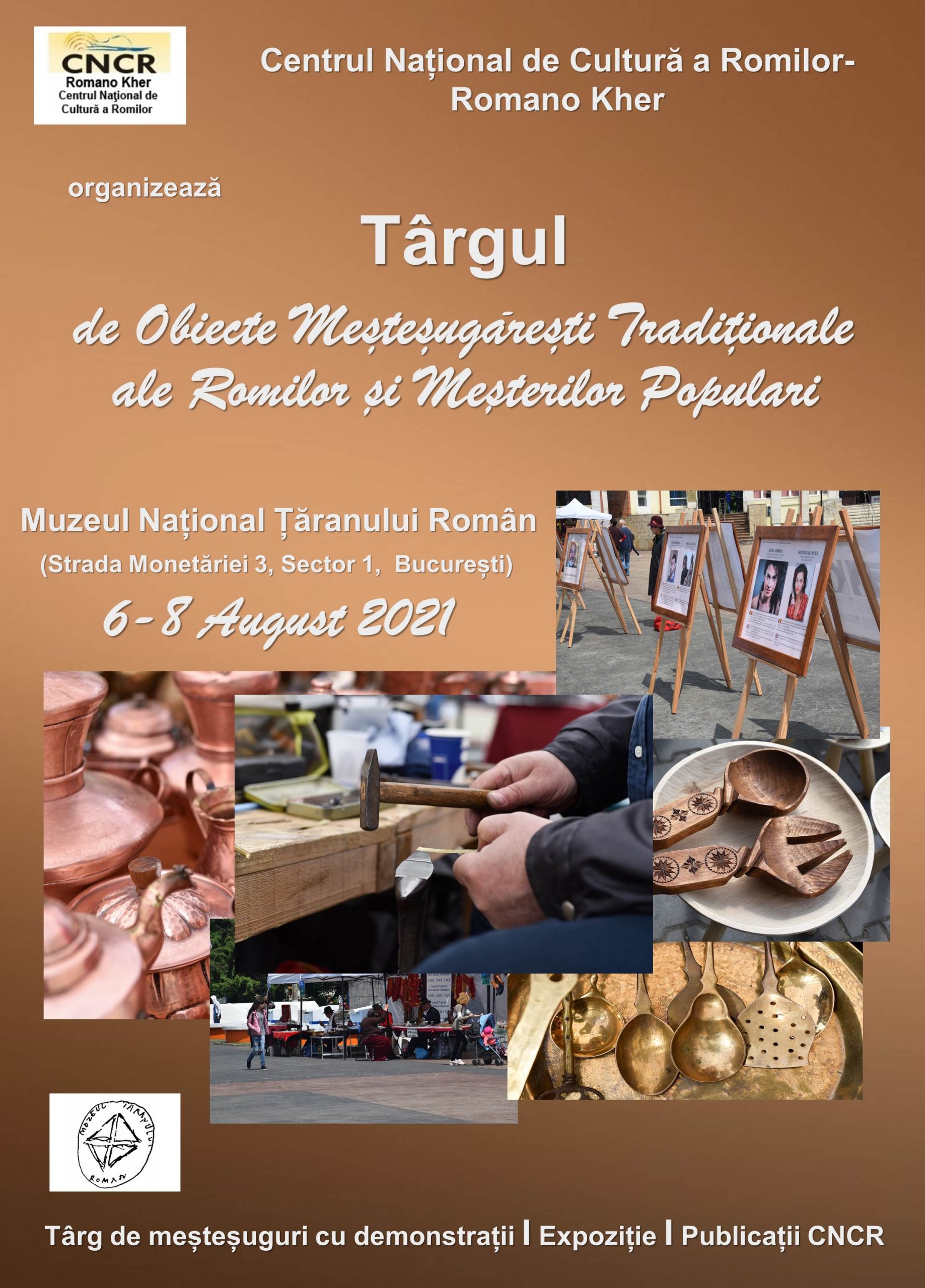 Centrul Naţional de Cultură a Romilor – Romano Kher, prin Asociația Meșteșugarilor și Comercianților Tradiționali Rromi, organizează în cadrul Muzeului Național al Țăranului Român, în perioada 6-8 august 2021, Târgul de obiecte meșteșugărești tradiționale ale romilor și meșterilor populari. Intrarea este liberă.