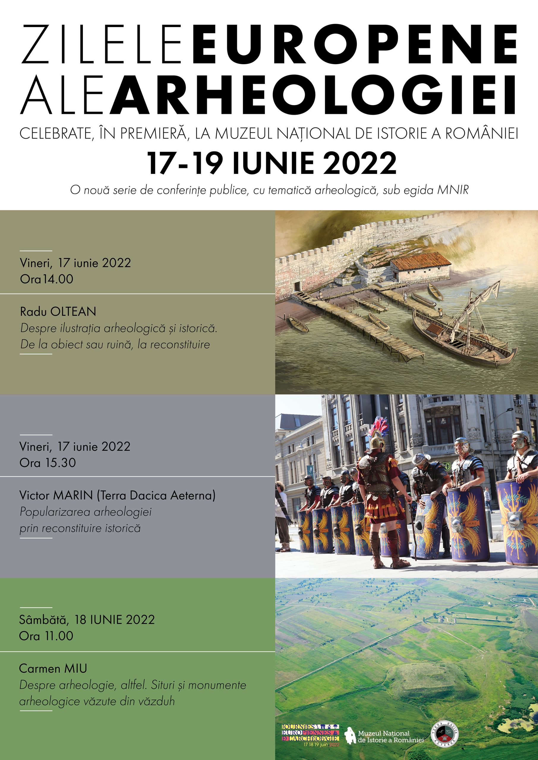 Muzeul Naţional de Istorie a României (MNIR) anunță celebrarea Zilelor Europene ale Arheologiei în zilele de 17 și 18 iunie 2022. Evenimentul propune o perspectivă inedită asupra domeniului arheologiei publice printr-o nouă serie de conferințe organizate la sediul său, fiind abordate teme deosebite ce aduc în atenție aspecte mai puțin cunoscute despre grafica arheologico-istorică, reconstituirea istorică și arheologia aeriană. Conferințele vor avea loc în Holul Central al MNIR. Accesul la eveniment este gratuit, în limita locurilor disponibile (50 de locuri).