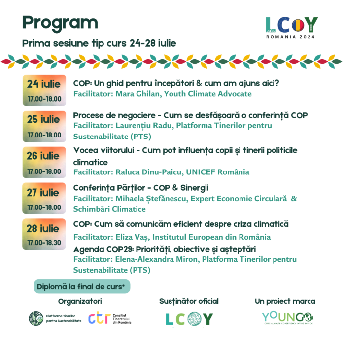 Platforma Tinerilor pentru Sustenabilitate și Consiliul Tineretului din România, cu sprijinul UNICEF, organizează în perioada 24-28 iulie primul eveniment din cadrul Conferinței Locale a Tinerilor privind Schimbările Climatice din 2024 (LCOY) în România, inițiativă ce se desfășoară la nivel mondial. Acest eveniment va continua cu alte sesiuni de consultare, informare și formare, ce se vor desfășura în perioada septembrie-octombrie 2024.