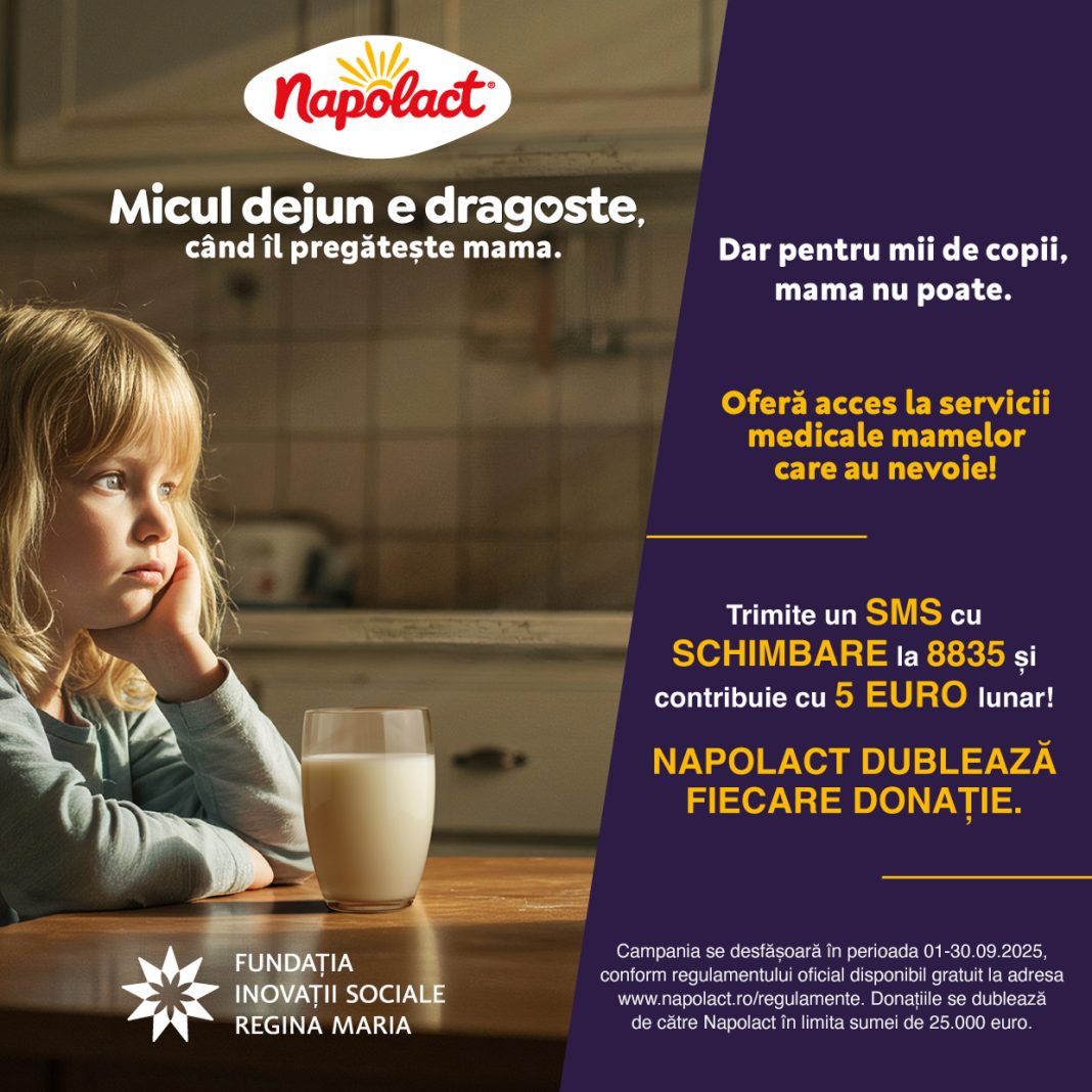 Campania „Micul dejun e dragoste, când îl pregătește mama” se desfășoară între 1 și 30 septembrie 2025. Pentru mai multe informații despre campanie și modalitățile de sprijin, vizitați: www.napolact.ro/doneazapentrumama sau www.fundatiainovatiisociale.ro/napolact-campanie